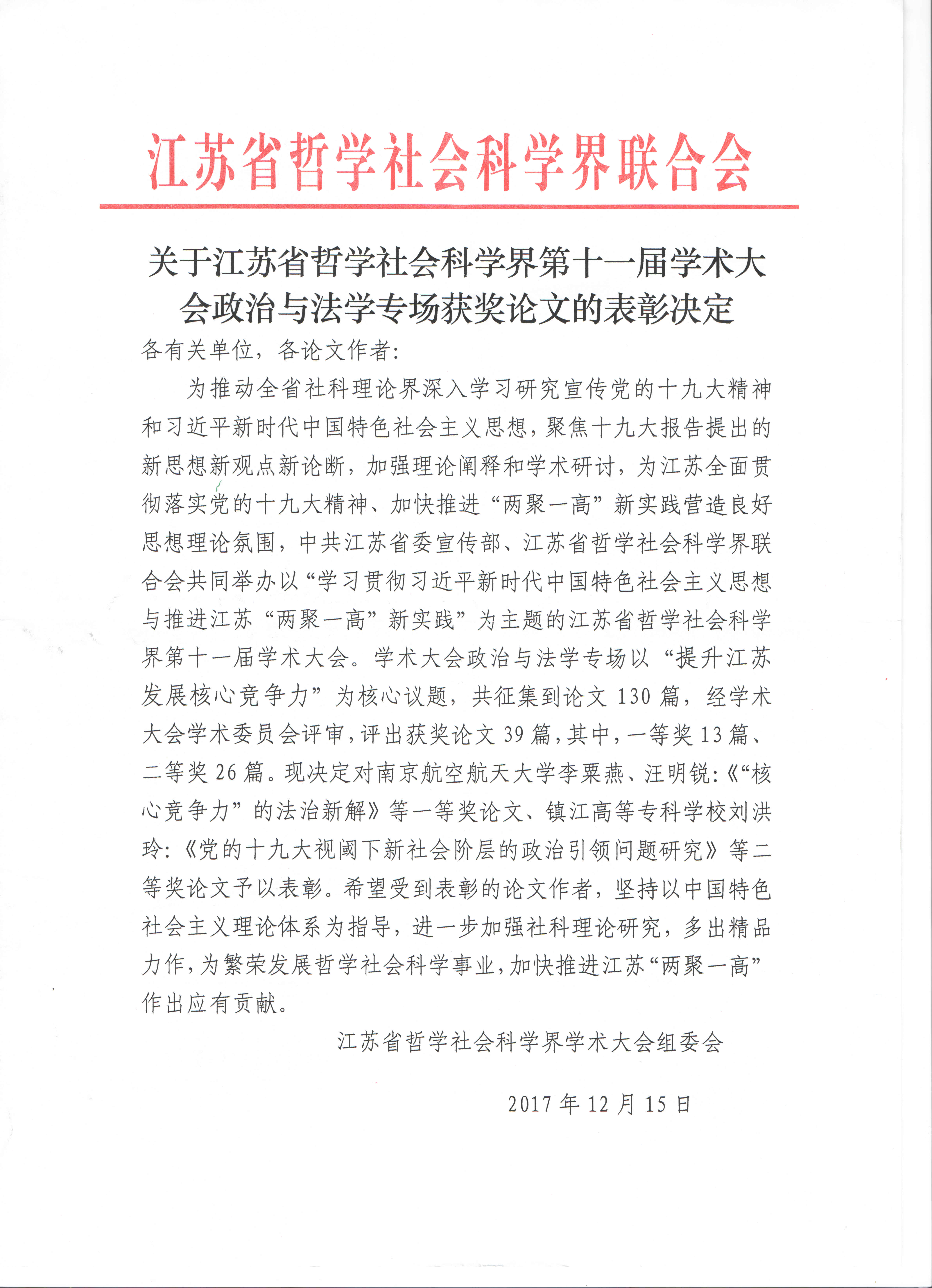 此次学术大会将促进全省哲学社会科学界在习近平新时代中国特色社会主义思想的指引下,为建设中国特色社会主义民主法治和提升江苏发展核心竞争力作出应有的学术贡献,而我校师生的获奖为提升南京航空航天大学在人文社科学科尤其是法学学科领域的影响力和美誉度,起到了良好的促进作用。