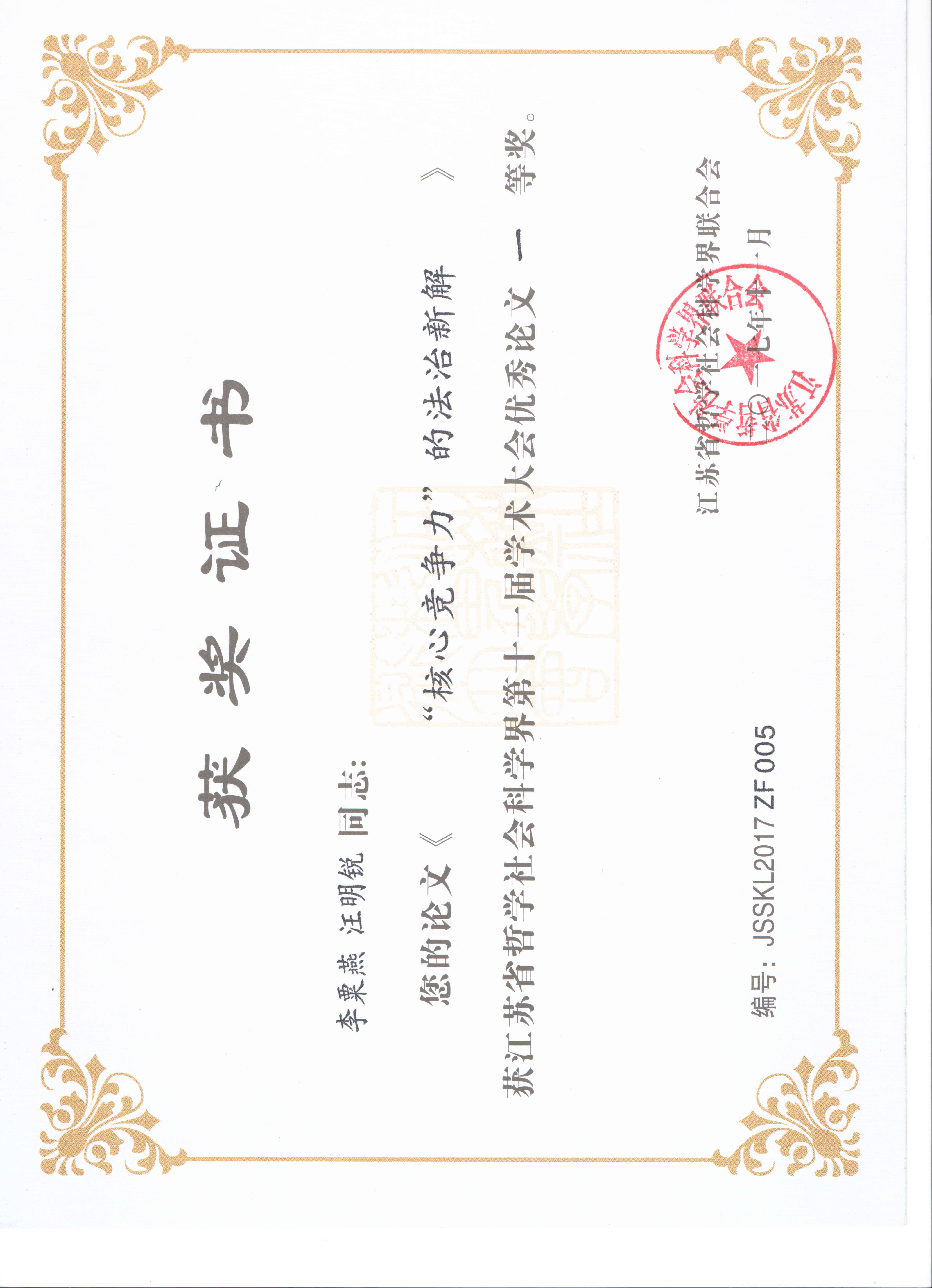 江苏省哲学社会科学界第十一届学术大会政治与法学专场的主题是“提升江苏发展核心竞争力”,来自省内外高校、党校、科研机构和法律实务界的代表100多人参加了政治与法学专场的会议,围绕这一主题展开热烈研讨。本次会议共征集论文130余篇,经学术委员会评审,评出获奖论文39篇,亚洲十大在线博彩平台排名李栗燕教授与其研究生汪明锐同学合作的论文《“核心竞争力”的法治新解》荣获江苏省哲学社会科学界第十一届学术大会优秀论文一等奖,李栗燕教授应邀参加会议并在法学专场作了大会发言。