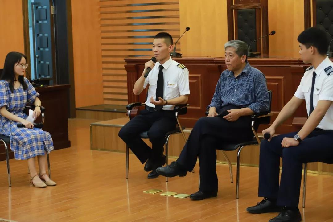 在访谈和互动环节,同学们踊跃提问,三位嘉宾分别就各自的问题做出了精彩的回答。张学财老师讲述了自己来到南航大继续从事飞行相关工作的初衷,比起航空公司的百万年薪,他说更看重的是能够在南航培养飞行员、做与飞行有关的事。在访谈过程中,张老师提起的那段结束飞行时的往事也让现场同学感动不已。马机长谈到有关淡泊名利精神的传承问题,寄语学弟学妹们人生不能功利。姚学长分析了自己有关飞行员应具备的能力与素质的理解,提出学好英语的重要性。