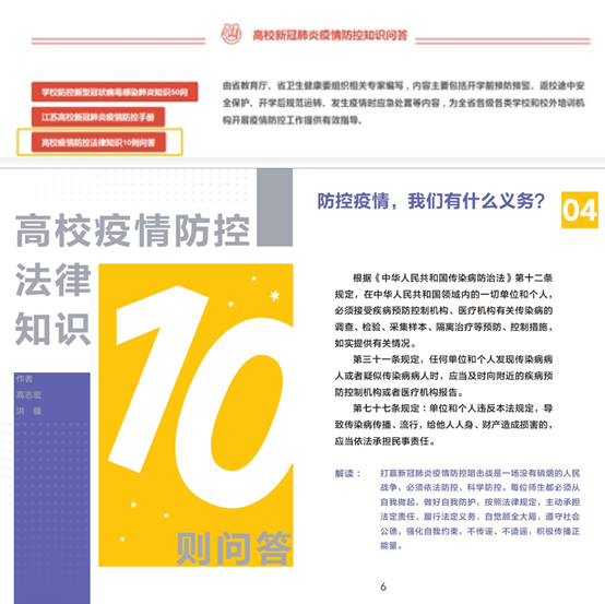 为进一步加强全省高校疫情防控宣传普法教育,省教育厅委托我校汇编《高校疫情防控法律知识10则问答》,在“江苏省疫情防控培训网”刊载,加大疫情防控法治宣传力度。