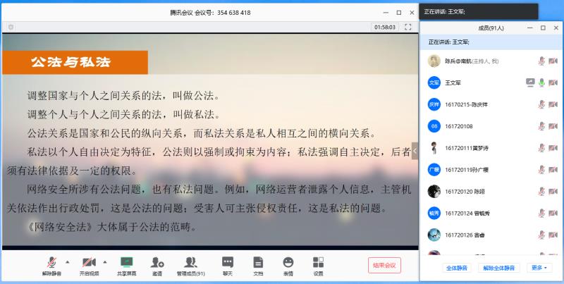 陈兵老师从互联网本身所存在的协议缺陷、安全漏洞以及由此所带来的各种网络攻击,尽管采用了很多技术来防止各种网络攻击,但是整个网络的安全只是靠技术远远是不够,必须还要有安全管理来弥补技术的不足。在安全管理中,特别是网络安全法是从法律角度对各种攻击行为、信息泄露等进行了约束。接着就此话题,王文军老师从网络安全立法展开,为信息安全专业的同学们介绍了网络安全问题,特别是涉及到的法律部门以及《网络安全法》的核心内容,随后结合相关案例深入浅出的阐释了网络运行安全制度与网络信息安全管理的基本知识,让同学们在学习网络安全专业技术知识的同时,能对技术相关的法律基础知识深入的了解,从而可以更好的把握技术运用的边界与维度,特别是针对信息安全专业的同学在从事职业工作时要严格坚守职业道德,遵循法律法规。