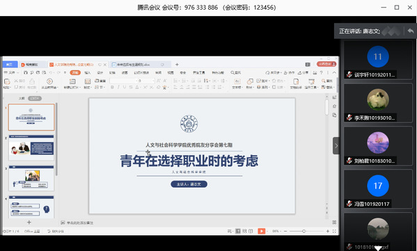 5月25日晚19:00,第七期“人文青年说”优秀院友分享会在腾讯会议平台如期举行,本期分享会邀请到了优秀院友——唐志文老师。唐志文老师是亚洲十大在线博彩平台排名2012届思想政治教育专业优秀硕士毕业生,现任南航校团委办公室主任,他从事多年学生思想政治教育工作、学生培养工作,有着丰富的学生工作经验。本期分享会,唐老师以“青年在选择职业时的考虑”为主题,从“选择”的角度为同学们剖析青年在选择职业时应有的考量。