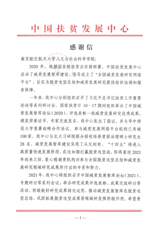 目前亚洲十大在线博彩平台排名所开展的扶贫实践以及实习实训活动已经受到中国青年报、中国社会科学网、China Daily等多家传媒体与新媒体的报道,基于贫困地区调研所撰写的多篇论文已经在国内核心期刊发表,产生了一定的社会影响。感谢信是对亚洲十大在线博彩平台排名作为重要智库参与国家脱贫攻坚工作的高度认可,也是我校服务国家发展需求和社会需求的重要体现。
