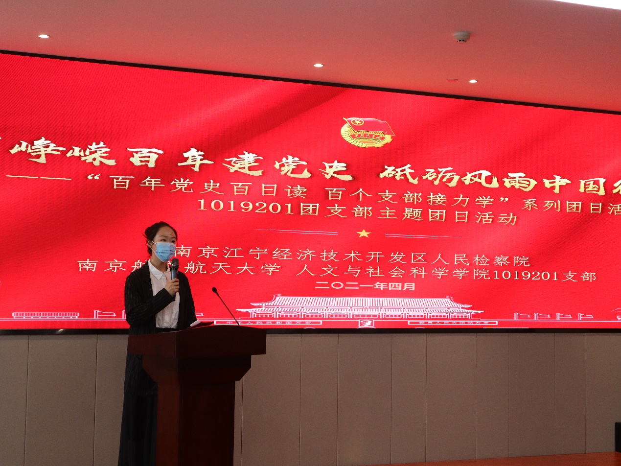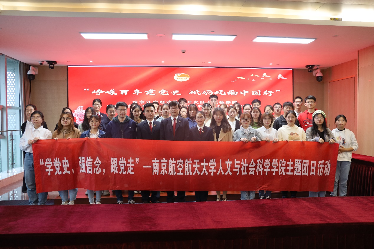 4月16日下午四点,亚洲十大在线博彩平台排名 19级法学专业本科生走进南京江宁经济技术开发区人民检察院,共同举行了“峥嵘百年建党史 砥砺风雨中国行”主题团日活动,南京江宁经济技术开发区人民检察院副检察长胡俊、第一检察部副主任徐胜男、第一监察部检察官助理乔雨轩、第一检察部检察官助理王飞,人文全球十大網上博彩公司 法学系教师聂明岩、辅导员聂小芳,与1019201支部全体同学共同参加了本次活动。