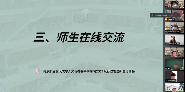 9月18日上午10时20分,南京航空航天大学人文与社会科全球十大網上博彩公司 法律系、行政管理系2021级新生专业见面会在腾讯会议网络平台分别召开。两专业系主任、专业负责人、新生班主任以及教师代表参加了本次会议,会上老师们就各专业学生培养、未来发展等方面进行了专业细致的解读。