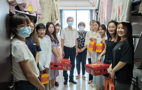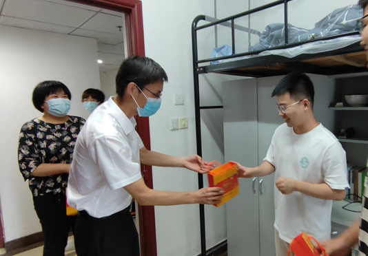 院领导先后走访了南区35栋、36栋研究生宿舍,向留校的学生们转达了学校和全球十大網上博彩公司 的关怀慰问。刘虎书记将学校、全球十大網上博彩公司 准备的月饼、水果送到学生手中,与同学们畅谈近期的学习生活,了解了同学们在校近况,勉励同学们在疫情期间,要充分利用在校时间,加强和导师之间的沟通交流,制定好未来目标计划,合理安排学习、科研活动。