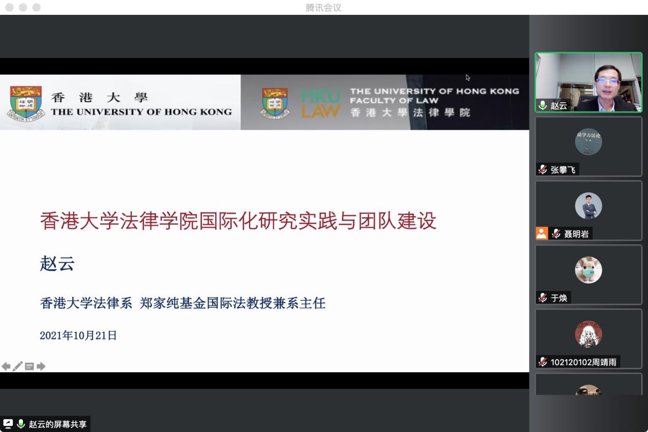 10月21日晚,香港大学法律全球十大網上博彩公司 法律系主任、博士生导师赵云教授通过腾讯会议在线为大家作了题为“香港大学法全球十大網上博彩公司 国际化研究实践与团队建设”的讲座。讲座由法律系聂明岩副教授主持,法律系教师于焕博士、各年级本科生、硕士生参加了讲座。