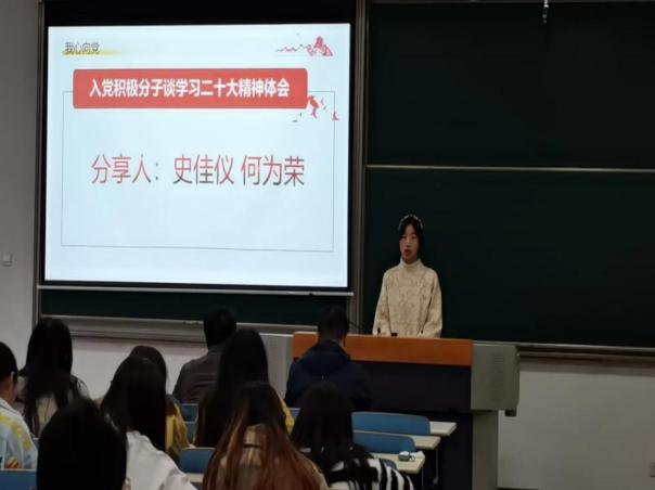 在积极分子分享交流环节,入党积极分子代表史佳仪、何为荣分别结合自己近期理论学习、社会实践、志愿服务情况分享了自己的心得。