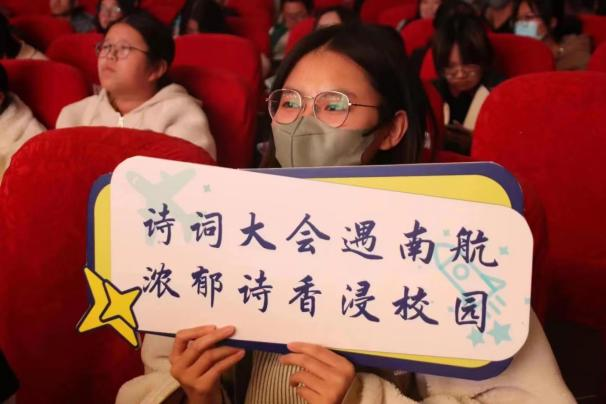活动由视频《诗意南航》拉开帷幕,视频中展示了南航学子在校庆70周年之际写下的百首情诗,共同绘就成了诗意南航。师生集体诵读《清平乐·六盘山》,从红色经典中汲取力量,带领现场观众开启了诗词之旅。
