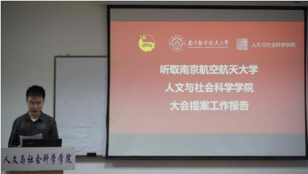冯文燕、孙敬阳代表本次学生会、研究生会筹办委员会作大会提案工作报告。提案涉及公共服务、教学管理、校园文化、权益维护等八个方面,共计24项。