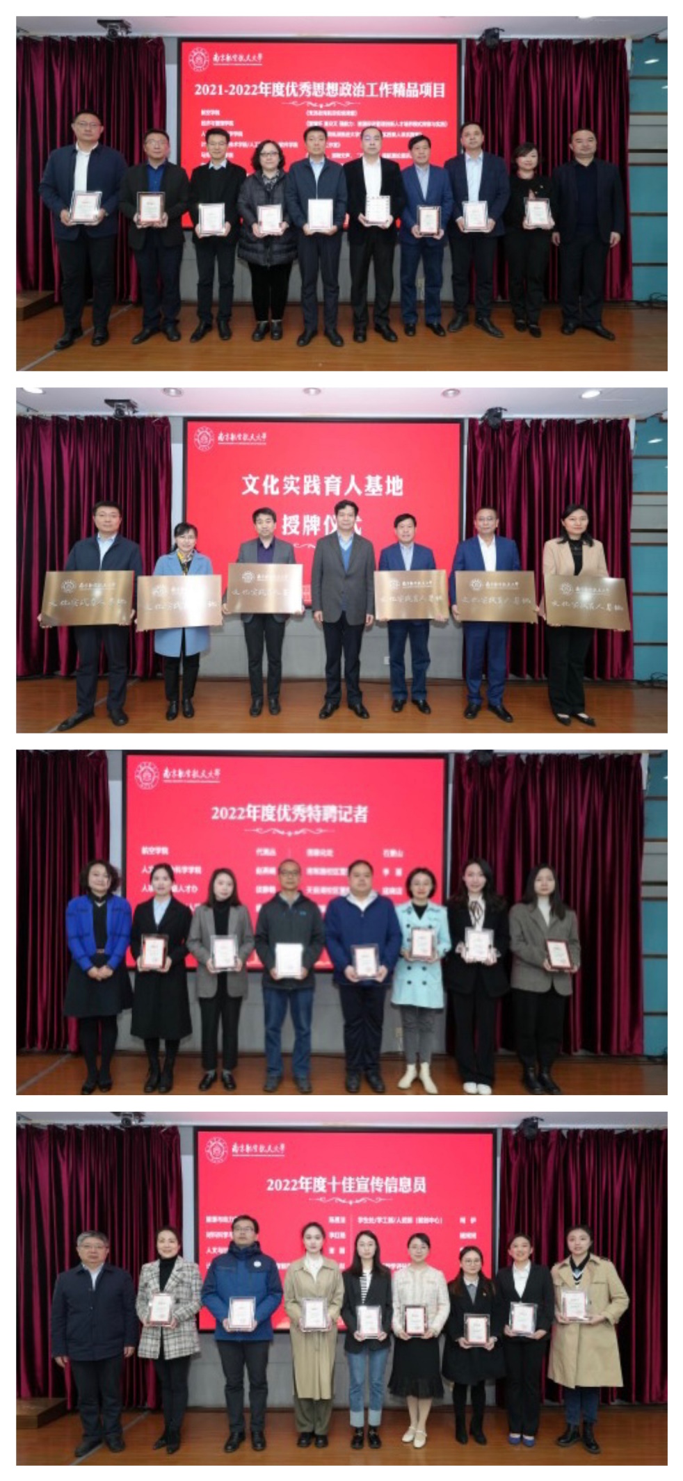 4月7日,学校召开了2023年宣传思想文化工作会。会议表彰了2022年度优秀特聘记者、十佳宣传信息员、优秀思想政治工作精品项目、学习贯彻党的二十大精神理论宣讲先进个人等奖项。校党委书记郑永安为学校六家 “文化实践育人基地”授牌。亚洲十大在线博彩平台排名宣传思想文化工作获得了学校的肯定,获得相关奖项如下: