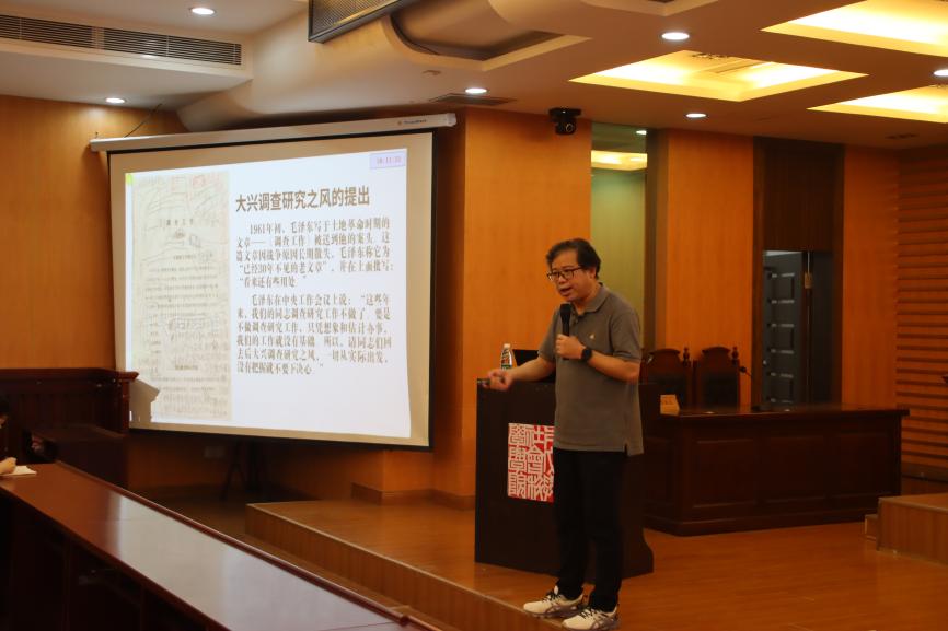 没有调查就没有发言权,坚持调查研究是中国共产党建党100多年以来一直保持的优良传统。鲁兴虎围绕党和国家领导人有关调查研究的重要论断和工作实践,结合生动事例为同学们解读了运用科学的社会调查方法对推进科学认知、形成科学决策、落实重要工作的重要意义以及如何做好调查研究的相关建议。他鼓励同学们积极践行党中央提出的大兴调查研究的要求,在论文撰写、学术研究、专业实习等学习和工作中,积极开展调查研究,科学运用专业方法,有效转化调研成果。