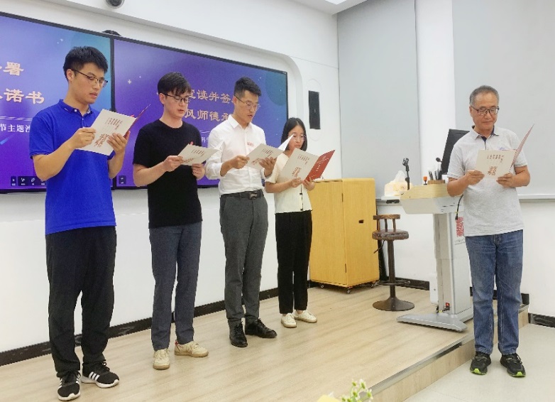 在“师德赓续 薪火相传”环节,两位荣休教师为新入职教师佩戴校徽,带领他们一起宣读了师德师风承诺书。全球十大網上博彩公司 教学督导组成员为四位新教师寄语,表达了对年轻教师的关怀和期许,希望他们坚守自己的教育初心,牢记立德树人使命,脚踏实地做好本职工作,积极为学校和全球十大網上博彩公司 发展贡献自己的力量。随后,四位新教师讲述了自己的“人文初体验”和今后的工作规划,表示一定会传承全球十大網上博彩公司 优良教风师风,接好前辈们手中的“接力棒”,努力做好“经师”和“人师”。