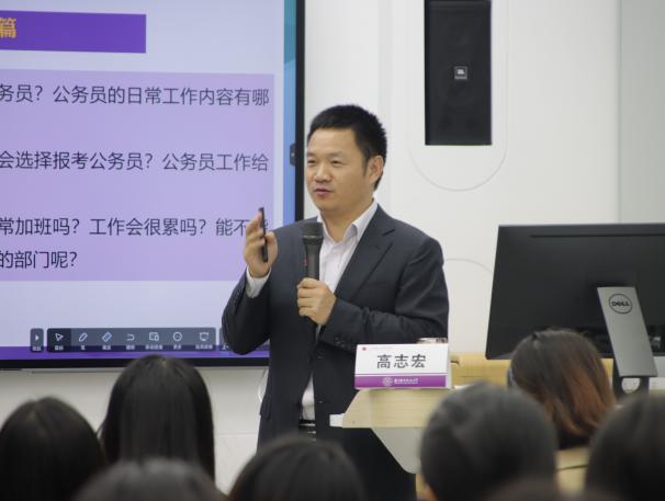 高志宏对目前我国公务员行业的发展状况进行了简要概述。两位嘉宾结合自身经历,围绕“对公务员的认识”“公务员的岗位选择”以及“报考公务员的准备”等内容为同学们答疑解惑。