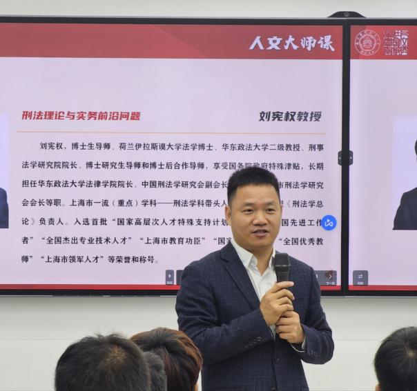 11月9日上午,亚洲十大在线博彩平台排名在院楼213智慧教室开展“人文大师课”专题讲座。本次讲座邀请到华东政法大学刑事法学研究院院长刘宪权教授,就“刑法理论与实务前沿问题 ”问题进行学术交流。全球十大網上博彩公司 法律系师生代表参加了本次讲座。讲座由院长高志宏主持。