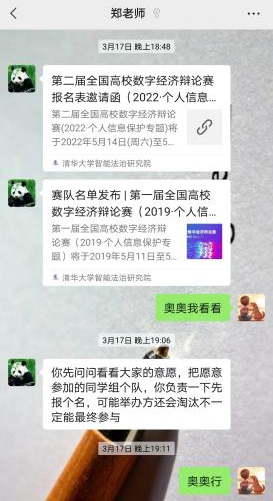 郑老师经常对我们说“教育不是一味地灌输,而是创造性地点燃火焰”,他希望大家主动去闯,鼓励但不强制,支持但不代管,“小楼,这个竞赛班级同学可以参加一下”,这是他经常性的叮嘱,鼓励我们勇敢迈出步伐去参加校内外法学竞赛活动、参与学生组织锻炼自己,耐心解答专业问题帮助我们培养专业能力,班集体也逐渐形成团结共进、相互成就的和谐氛围。
