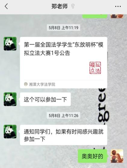 班主任的身份并没有掩盖郑老师身上“法学人”特质,“尊法是关键,学法是保障,守法是目的,用法是归宿,四者环环相扣、相辅相成”,他经常与我们分享这些接地气的“大道理”;专业教师、班主任的双重身份也让他格外注重培养我们的专业认同感,“法以强国、宪以载道,全面提升国家治理体系和治理能力现代化,需要越来越多专业化、职业化的高素质法律人才”,他时刻提醒我们要有专业自信、专业认知,于是他的课堂总会将实践技能与职业操守认知高度融合,经常采用案例说课的形式,引导我们对现实案例中律师实然做法、应然做法进行评价,分析不同道德理由的冲突,带着我们拨开云雾见月明,在思考中对法学专业产生更为深刻的理解。