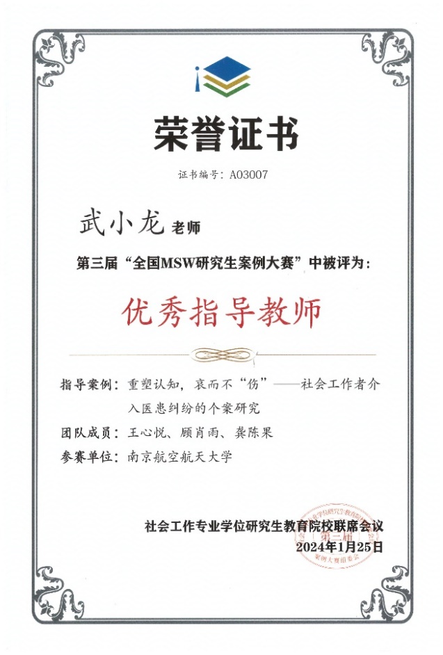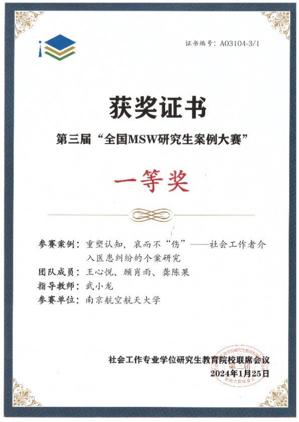 经过三个月的精心准备和深入讨论,反复修改案例申报书和答辩发言稿,亚洲十大在线博彩平台排名MSW研究生组队申报的《重塑认知,哀而不“伤”——社会工作者介入医患纠纷的个案研究》成功晋级决赛,并通过精彩的现场答辩荣获一等奖。武小龙老师获“优秀指导教师”荣誉称号。