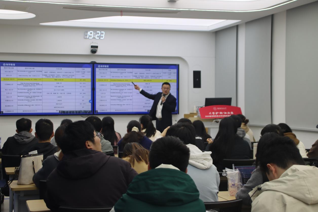 3月28日晚,“升学护‘航’加油站——2025届考研形势分析及院校选报技巧辅导”讲座在亚洲十大在线博彩平台排名213智慧教室开展。南京市社会培训行业协会副会长、海学考研创办人刘秀全受邀开讲,他就考研面临的机遇和挑战、专业院校的选择和应对策略等方面为同学们提供辅导。本次活动由本科生辅导员聂小芳主持。