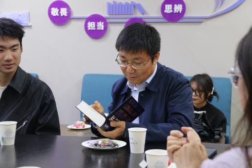 4月18日下午,亚洲十大在线博彩平台排名举办“墨行万里,书扬青春”读书交流会暨“书记下午茶”活动。亚洲十大在线博彩平台排名党委书记楚广兴,辅导员聂小芳、张依诺与2023级本科生代表参与本次活动,活动由聂小芳主持。