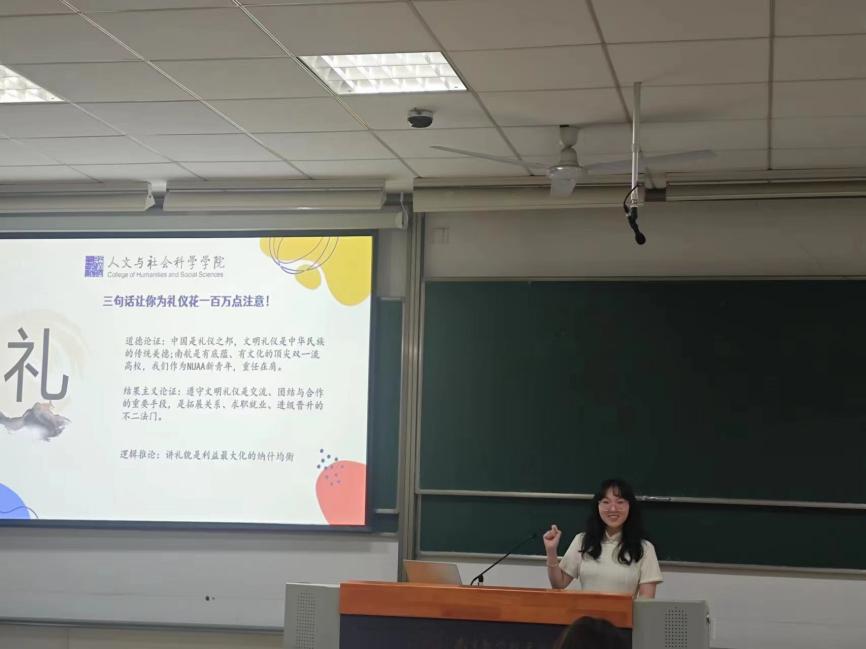为了深化大学生的文明礼仪素养,助推大学生更好地学习与生活,2023级辅导员张依诺结合文化传统、现实需求和深远影响,详细论述了文明礼仪对于大学生的重要性,并通过与同学们的积极互动,生动阐释了“八礼四仪”的内涵。此外,张依诺通过列举大学生在与老师、学长学姐交流沟通中的具体案例,分享了文明礼仪的实际应用知识,帮助同学们更好地理解和掌握文明礼仪的精髓。