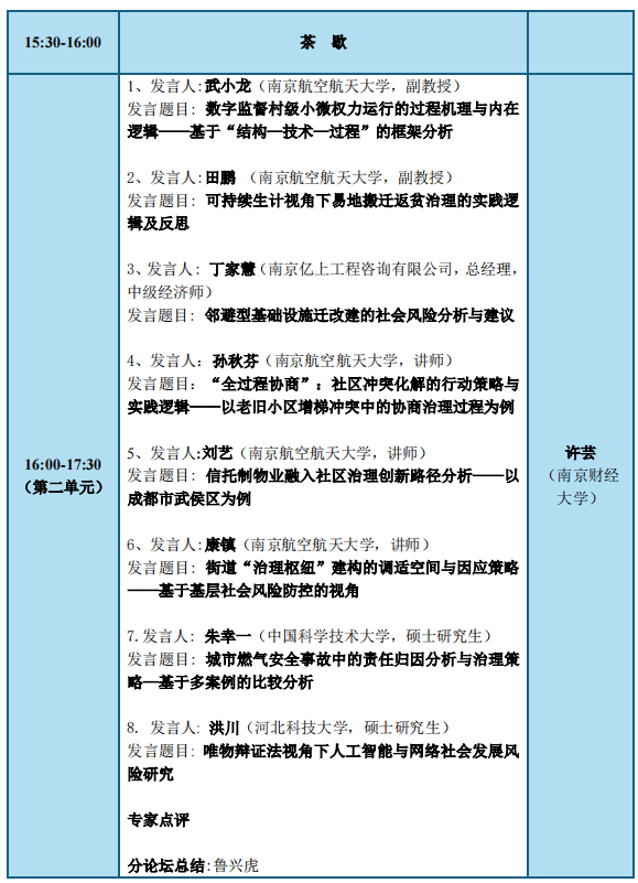 第二单元由南京财经大学法全球十大網上博彩公司 社会工作系主任许芸副教授主持,河海大学杜春林副教授作学术点评。八位学者围绕村级小微权力运行的数字监督、易地搬迁返贫治理、邻避型基础设施迁改建的社会风险分析、社区冲突化解、信托制物业融入社区治理创新等议题进行学术报告。其中,亚洲十大在线博彩平台排名公共管理系武小龙副教授、田鹏副教授以及孙秋芬、刘艺和康镇等教师分享了新近的研究成果。会上各位学者发言精彩纷呈,主题聚焦,讨论热切,营造出浓厚的学术共同体氛围。