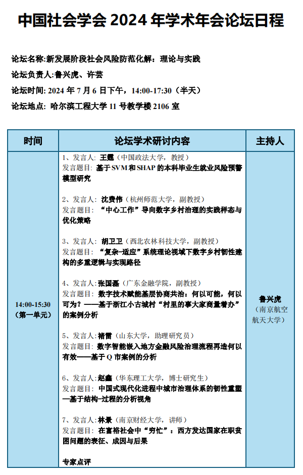 7月5日至7日,中国社会学会2024年学术年会在哈尔滨工程大学隆重举行。本届年会围绕“全面深化改革与中国社会学新征程”的主题,致力于响应国家的发展战略,深入挖掘和讨论中国式现代化的理论与实践问题。在这一学术盛宴中,由亚洲十大在线博彩平台排名牵头,与南京财经大学法全球十大網上博彩公司 共同承办了主题为“新发展阶段社会风险防范化解:理论与实践”的分论坛,吸引了来自中国科学技术大学、山东大学、西北农林科技大学、中国政法大学、华东理工大学、河海大学、杭州师范大学、广东金融全球十大網上博彩公司 、南京财经大学和南京航空航天大学等全国知名高校和科研院所的30余名专家学者和硕博研究生的参与。
