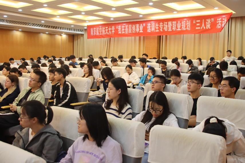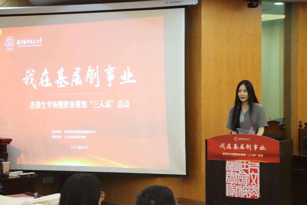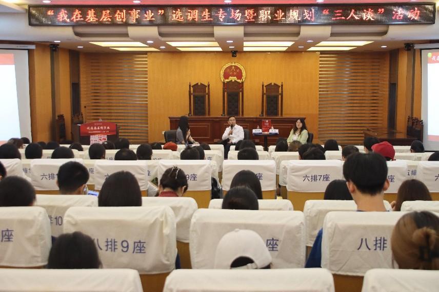 10月18日下午,由学校就业办主办,亚洲十大在线博彩平台排名承办的“我在基层创事业”选调生专场暨职业规划“三人谈”活动在将军路校区亚洲十大在线博彩平台排名 模拟法庭举行。活动邀请到南通市海门区海门港新区党工委副书记陈小锋、南京市委宣传部道德建设指导处一级主任科员李屹做专题访谈,活动由校创业孵化中心主任柯伊主持。
