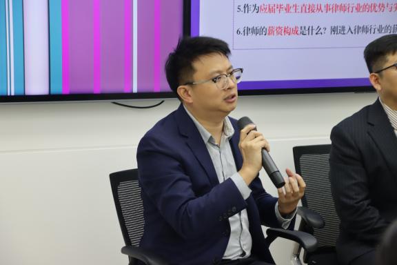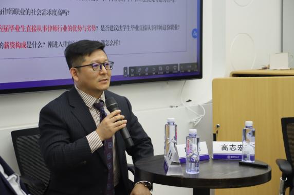 高志宏介绍了律师行业的现状及其在未来的发展趋势,表示目前律师行业人数不断壮大,专业分工更加细化,作为律师需要不断提升自身专业素养和职业水平;舒群、杨华分别介绍各自律所的发展历程、组织架构、业务领域等具体情况;接着,两位嘉宾分别结合自身经历,围绕对律师职业的认识、律师需要具备的基本技能、律师的选拔标准、律师的学历要求、律师的职业发展渠道以及职业选择的注意事项等几个方面分享个人律师工作经验和心得感悟,为同学们未来开启律师职业大门提供了清晰的指引和可行性建议;他们鼓励在场同学要打牢专业基础、积极参与实践、拓展知识面,为以后成为一名合格的法律人奠定基础。