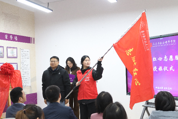贡海俊为“溧”炼红心志愿服务团队授旗,“溧”炼红心志愿服务团队正式成立,志愿者们将以旗帜为指引,在服务社会和发展成长自我的道路上继续努力。