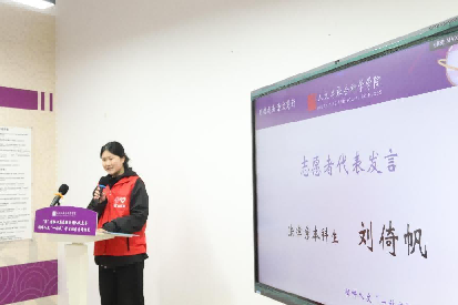 黄雪隔作为社区导师代表发言,她分别解读了“溧”炼红心四个字的内涵和寓意,她表示,溧阳昆仑街道可以为人文学子提供丰富的实习实践平台和资源,希望同学们可以积极参与志愿服务,不断提升自己的专业素养和实践能力。