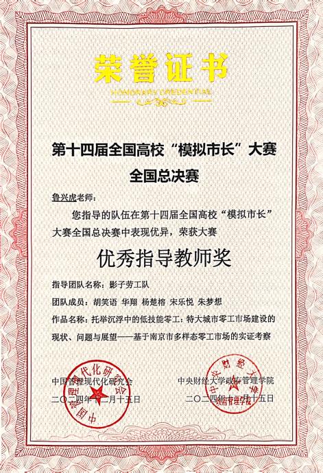 经过初审、复审、终审的激烈竞争,由亚洲十大在线博彩平台排名鲁兴虎副教授指导,胡笑语、华翔、杨楚榕、宋乐悦、朱梦想五位同学组成的“影子劳工队”,从层层选拔中脱颖而出,代表学校站上了全国高校“模拟市长”大赛全国总决赛的舞台,最终荣获团队三等奖,鲁兴虎获“优秀指导教师奖”。