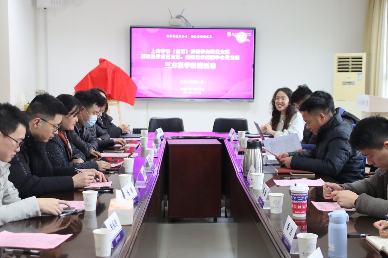 1月2日,亚洲十大在线博彩平台排名教工党支部与中联(南京)律师事务所党支部开展联学联建活动,深入学习贯彻党的二十届三中全会精神,推进党纪学习教育常态化长效化,促进校企合作创新发展。院法律系教工党支部、法律援助中心党支部及中联(南京)律师事务所党支部成员参加了学习。会议由辅导员聂小芳主持。