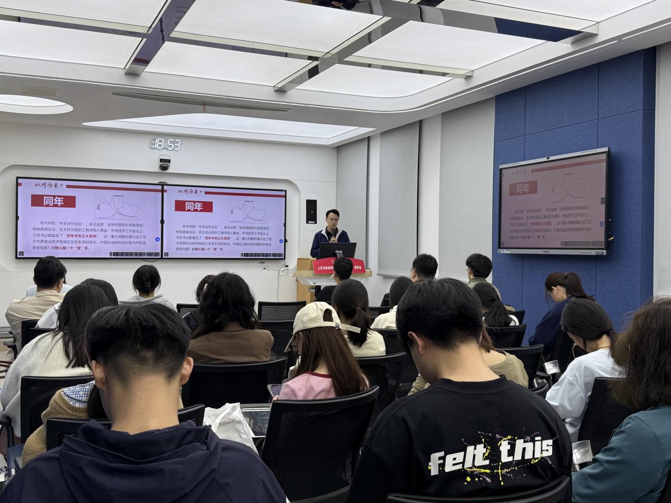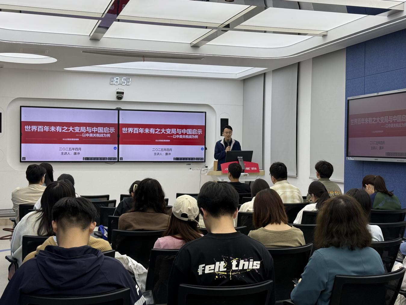 康冲结合政策研究与教学经验,深入剖析了世界百年未有之大变局的提出背景及意义,以中美关税战为切入点,从理论到实践,从全球到中国,以详实的案例和独到的见解,勾勒出大变局下的中国答卷,使同学们既感受到时代浪潮的澎湃,更体会到中国道路的坚定与从容。