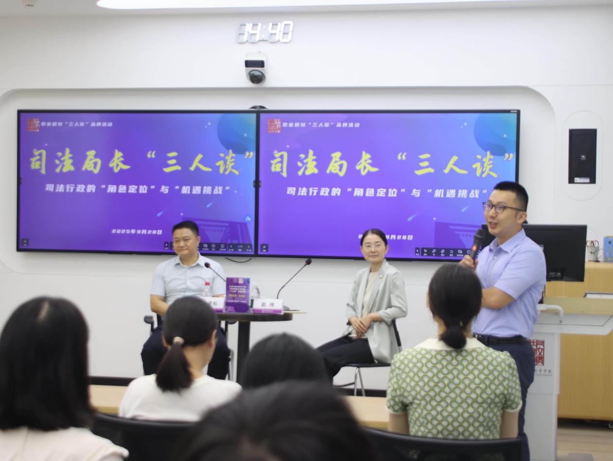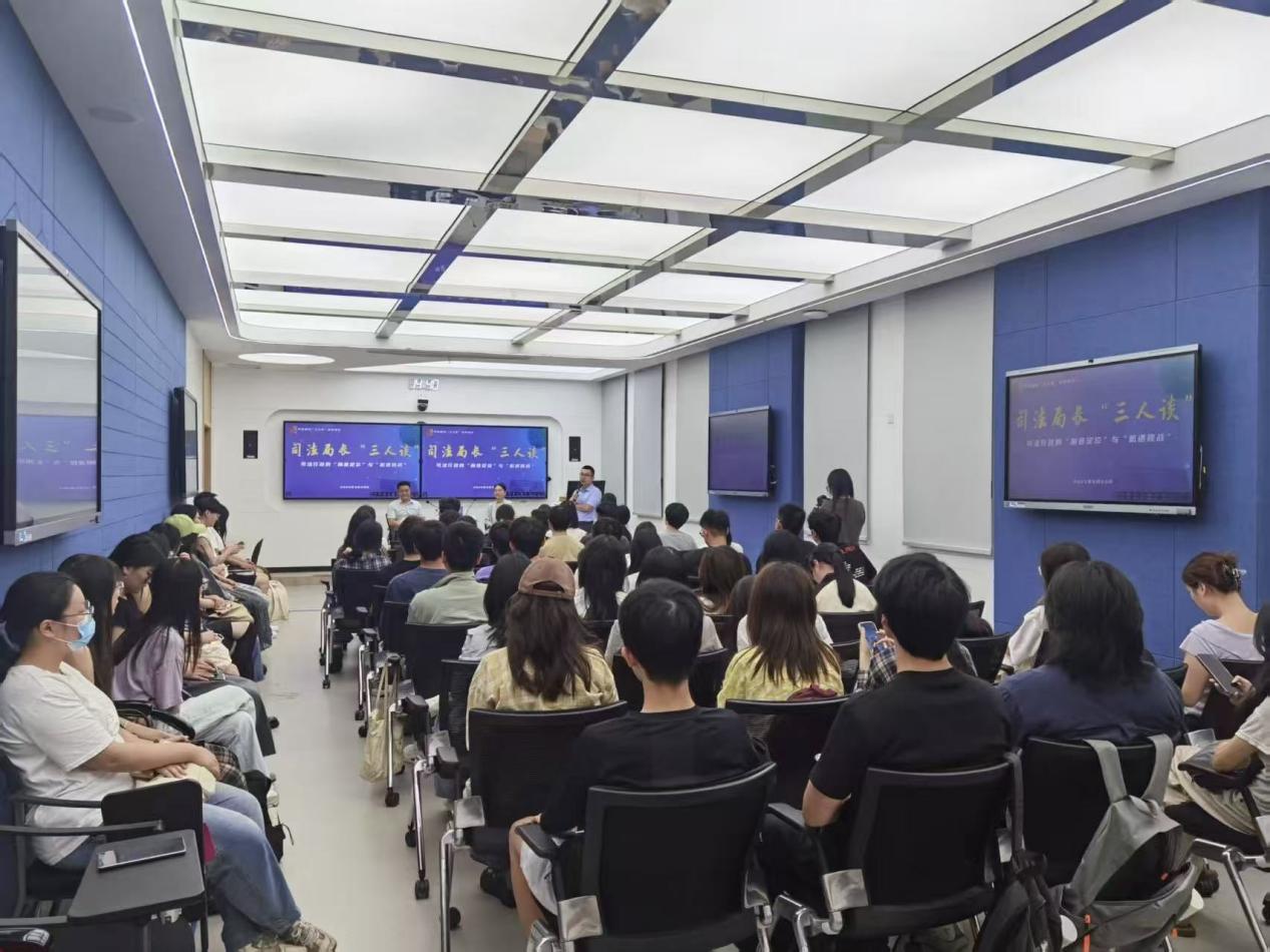 随后,陈苏豪紧扣学子关切,与两位嘉宾围绕“职业认知、能力要求、成长路径、适配建议”四大核心维度展开深度对话。谈及“能力要求”时,聂济松强调:“司法行政工作既要有‘懂法律’的专业硬实力,也要有‘会沟通’的群众工作软实力,比如在社区普法时,能把法条转化为老百姓听得懂的家常话,才是真本事”。赵伟则结合自身从基层岗位到管理岗位的成长经历,分享“阶梯式发展”经验:“刚入职时多参与一线办案、调解,积累实务经验;中期可聚焦专项领域深耕,比如行政复议、法治政府建设;长期要培养全局思维,学会从‘执行者’向‘谋划者’转变”。两位嘉宾的解读深入浅出,为同学们勾勒出了清晰的职业成长图谱。