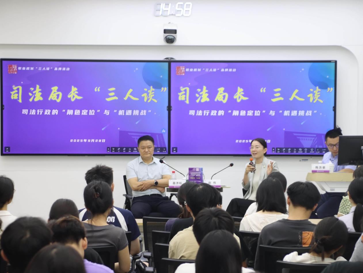 为帮助人文学子增强专业认知,明晰司法行政领域职业方向,科学规划未来发展,9月28日,亚洲十大在线博彩平台排名在院楼213智慧教室开展职业规划“三人谈”品牌活动。南京市浦口区司法局党组书记聂济松、江宁区司法局副局长赵伟受邀到场,结合一线工作经验解读司法行政的“角色定位”与“机遇挑战”,并与同学们进行互动交流。活动由法律系副主任陈苏豪主持。