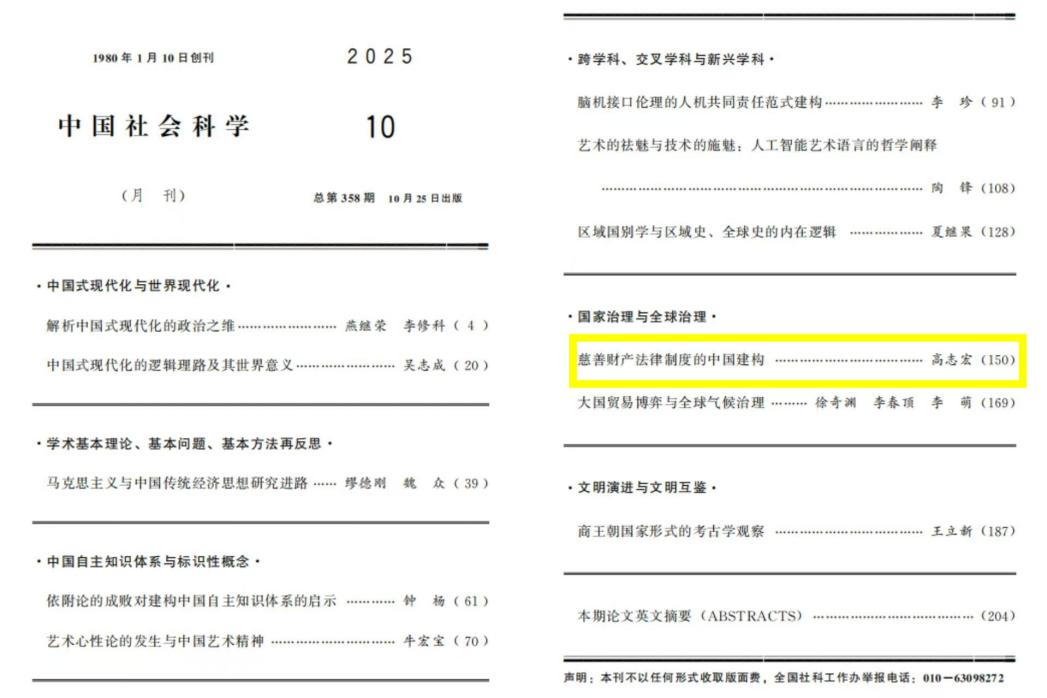 近日,亚洲十大在线博彩平台排名院长高志宏教授的论文《慈善财产法律制度的中国建构》在人文社科领域顶级期刊《中国社会科学》2025年第10期正式发表。高志宏教授作为唯一作者刊发论文,是我校在法学研究领域的重要突破,进一步彰显了学校法学学科建设的显著进展与学术影响力。